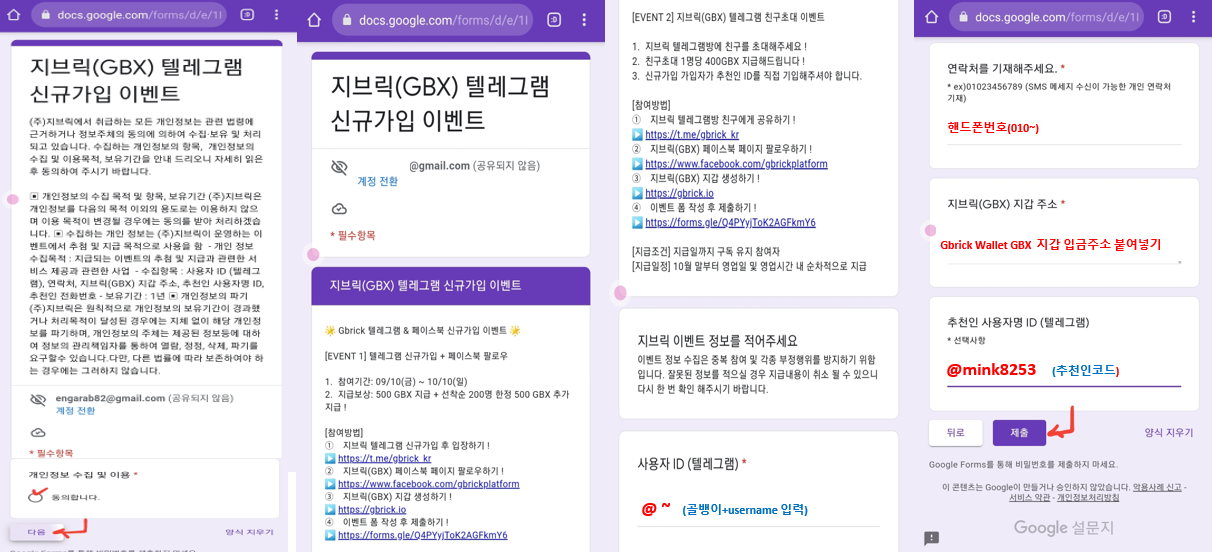 텔레그램 입장하기, 페이스북 팔로우, 지브리 지갑설치(이미 위에서 함), 이벤트 폼 작성임.
