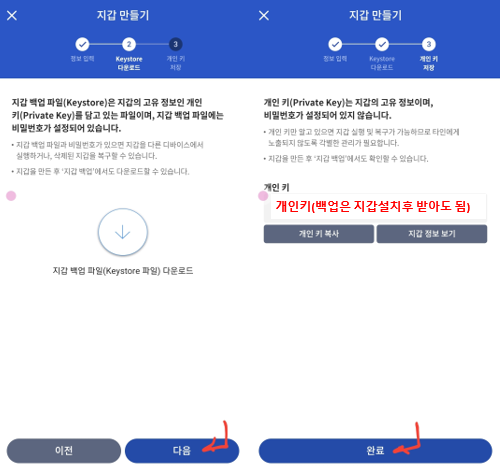 개인키 백업은 지갑 다 만들고 해도 됨 다음, 완료하면 지갑생성 끝