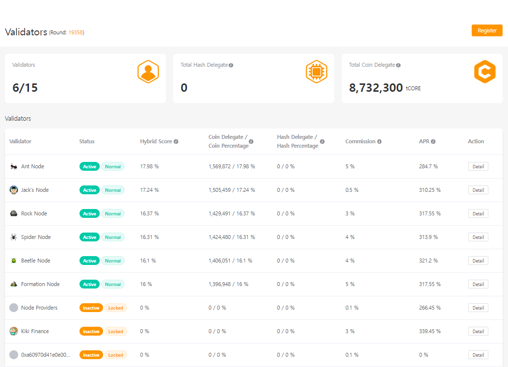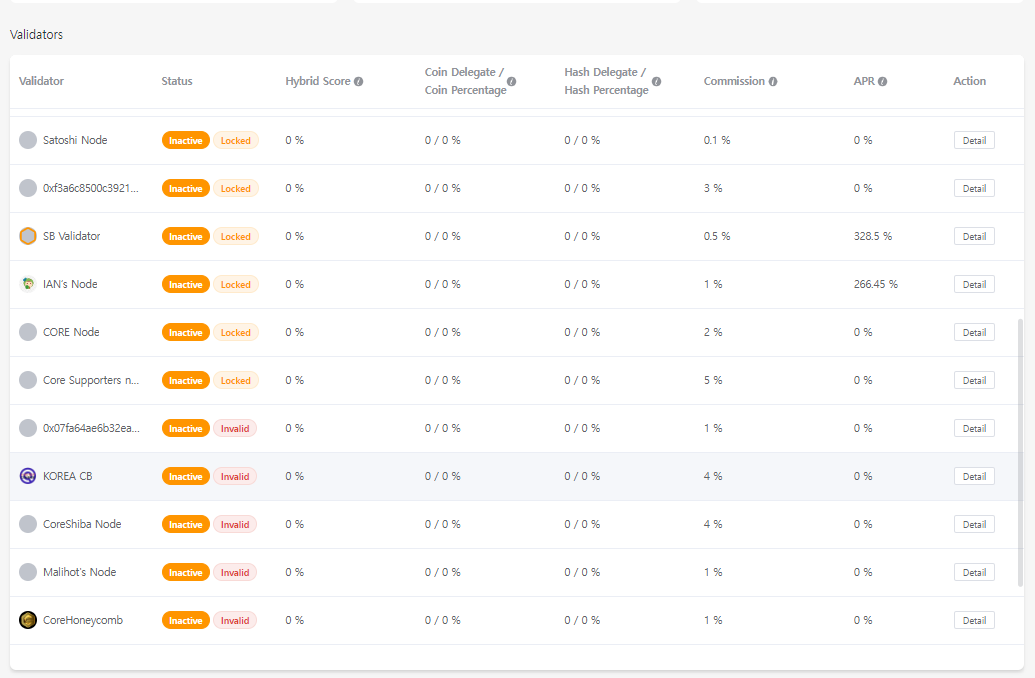 1.Testnet상에는 현재 비트위임해시가 0가 코어위임수량 %으로만 하이브리드 스코어(S)가 계산됨