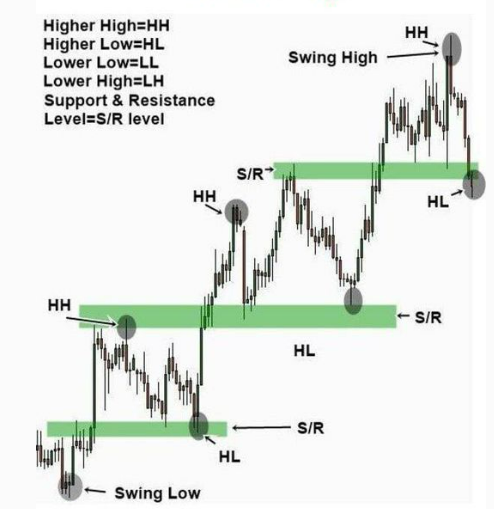추세변화의 변곡점을 SWING 이라하고 아래와 같이 상승추세일 경우 HH, HL, HH, HL, HH, HL 식으로 부분적인 파동의 변화가 있긴 하지만 상승추세임.