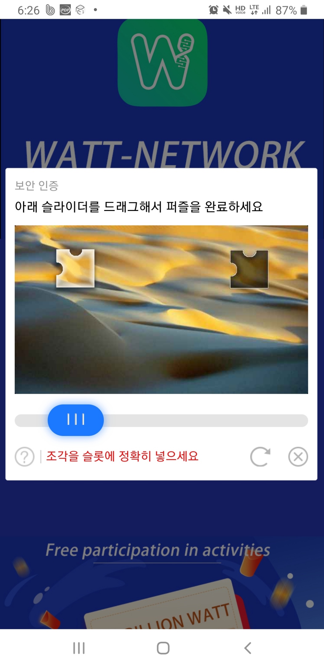 문자 인증번호 입력 : 퍼즐을 오른쪽으로 끌어 맞추면 인증번호를 받아 입력